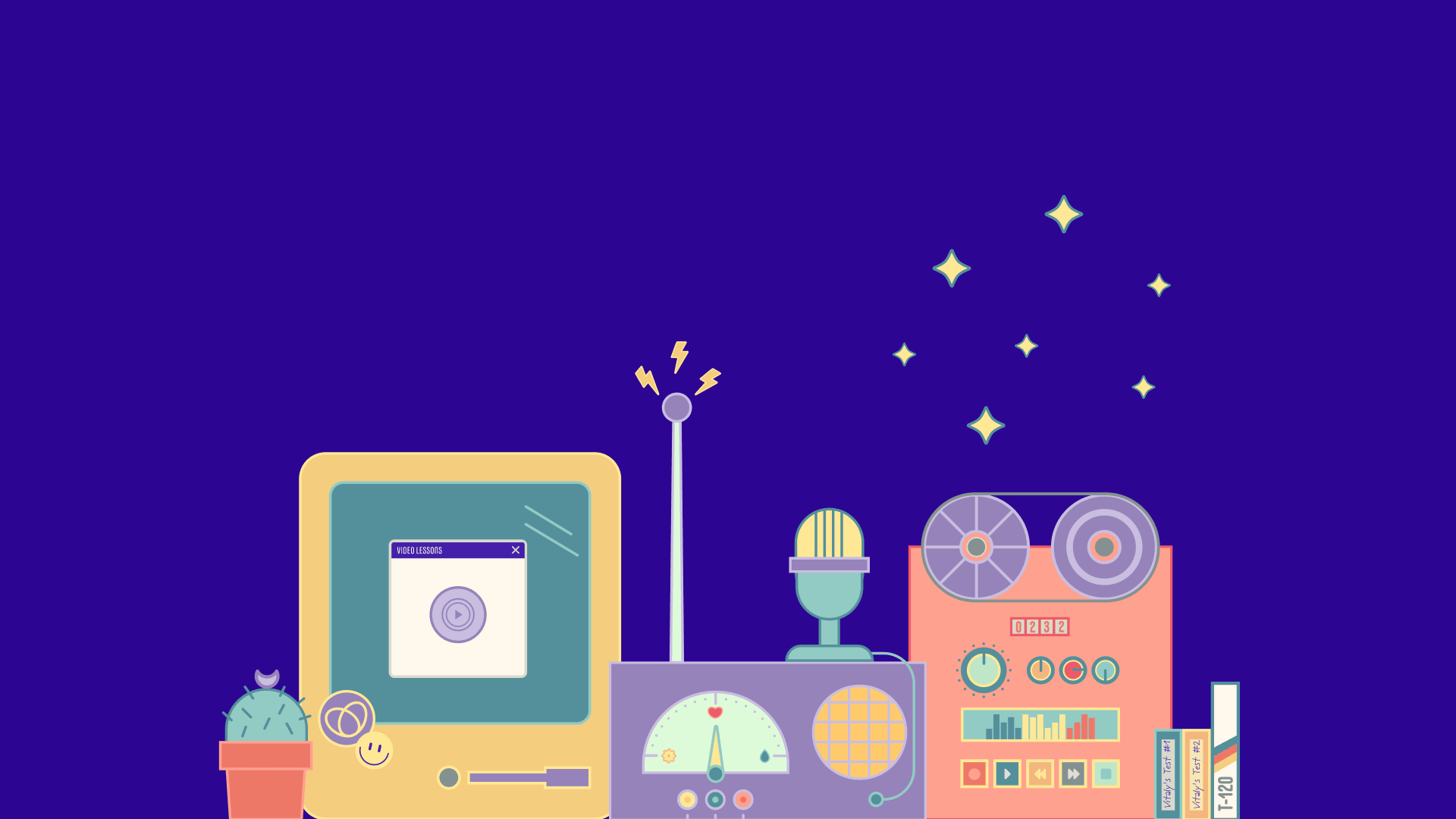 For the hero, I designed a single illustrated composition that gathers the whole world into one frame. It's the metaphor for the entire site distilled into a single image: AI as something you tinker with on your desk, the way a generation once tinkered with their first home computer.